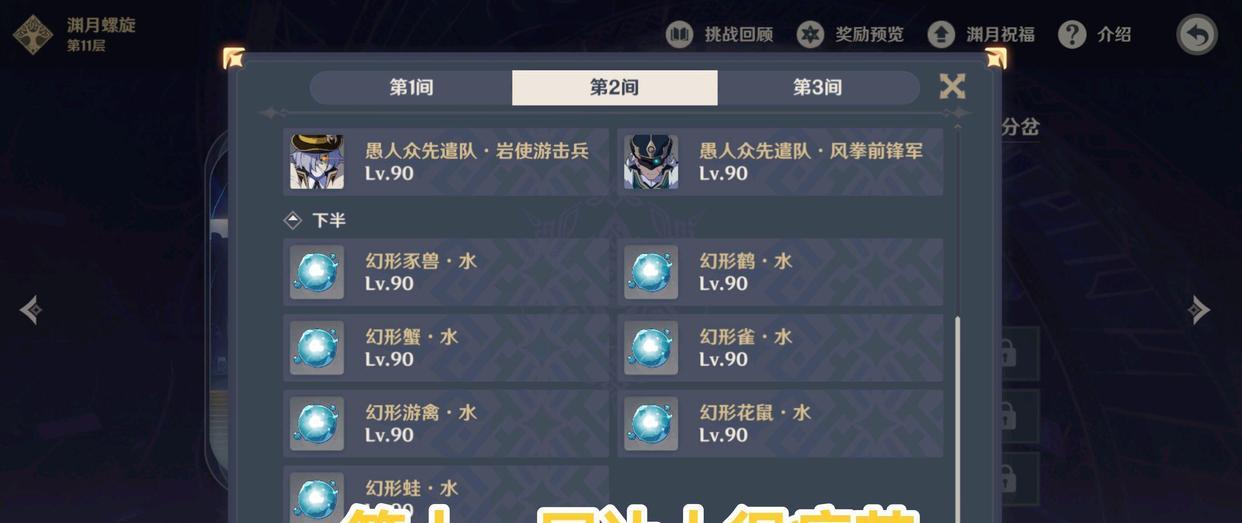 十二层难度大这是众所周知的事,但是本期深渊其他层数也很难,比如十一层第2间下半场,竟然是纯水精灵的小怪?请问这怎么打?水元素角色直接报废。