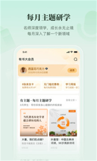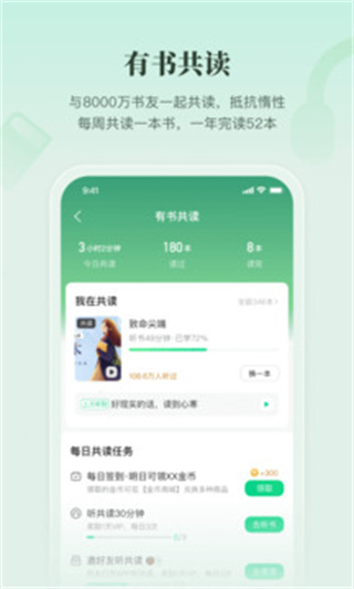 有书共读一款主为学习的领读平台软件,平台内包含书籍总类齐全,致力于帮助那些有读书意愿但有惰性没什么动力的人群去自主的学习,增加知识。