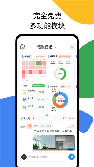 1、可以按消费场景细分记账类别,让用户精准记录餐饮、运动、通话、出行等不同场景的支出金额;