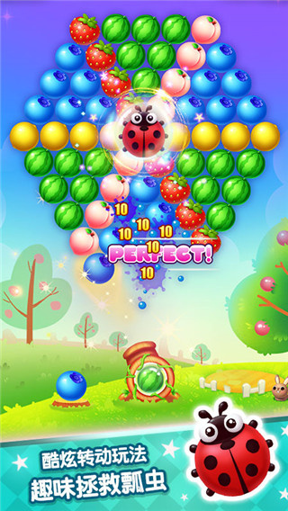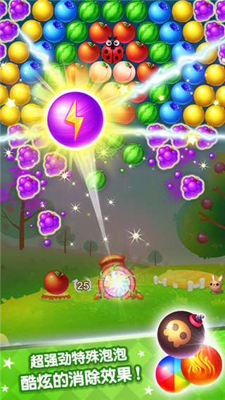 《水果泡泡传奇》是一款趣味感十足和休闲好玩的消除类游戏,采用了丰富的水果为核心题材。游戏的玩法非常经典,将三个或更多一样颜色的泡泡进行匹配就可触发消除的效果,虽然玩法不难,但是非常考验消除技巧和策略能力,需要想尽办法将泡泡进行连击以便能获得特殊的道具,有了道具的帮助就可更轻松地完成任务,丰富的游戏关卡设计,有些关卡的玩法不同,充满了无限的挑战性。