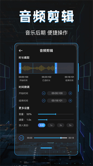 3、【音频剪辑】强大的音频剪辑功能,让你轻松裁剪、拼接、混音各种音频片段。精准的剪辑工具,支持对音频的淡入淡出、音量调节、速度控制等操作,使你的音乐素材完美融合。